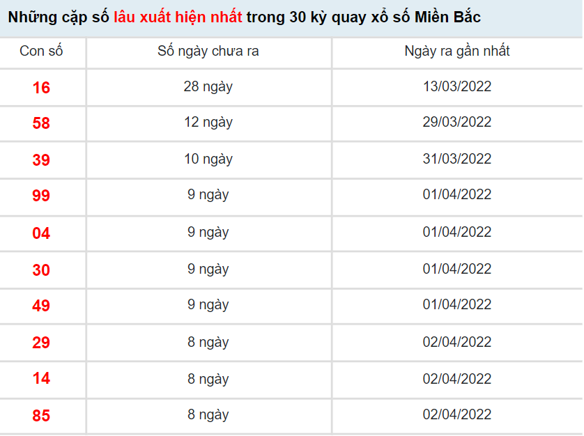 Thống kê XSMB hôm nay 12/4/2022 mang đến cho người chơi những thông tin hữu ích để dự đoán xổ số miền Bắc 12/4/2022 chuẩn xác. Thống kê chi tiết các bộ số loto gan lâu ngày chưa ra kèm theo các cặp loto MB ra nhiều trong 30 ngày qua.
