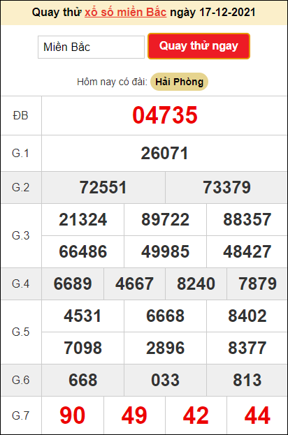 Các bạn có thể thử vận may tìm ra con số may mắn của mình bằng cách tham gia Quay thử XSMB. Bên dưới đây là bảng quay thử XSMB ngày 17/12/2021 mà chúng tôi đã thực hiện, mời bạn tham khảo: