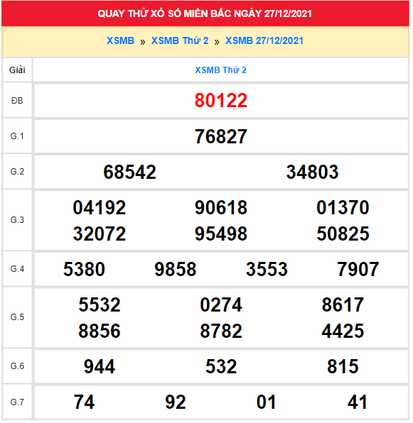 Cùng chuyên gia KETQUAXS dự đoán Miền Bắc 27/12/2021 hôm nay siêu chuẩn với các kết quả dự đoán giải đặt biệt đầu đuôi, giải lô tô 2 số, lô xiên chính xác nhất.