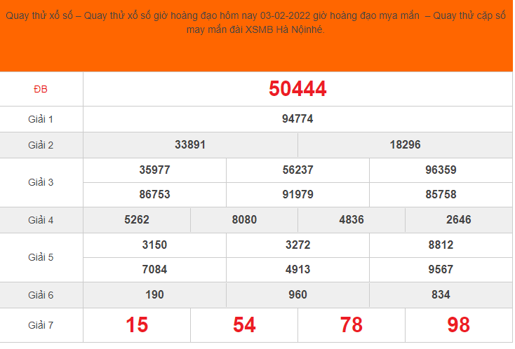 Các bạn có thể thử vận may tìm ra con số may mắn của mình bằng cách tham gia Quay thử XSMB. Bên dưới đây là bảng quay thử XSMB ngày 3/2/2022 mà chúng tôi đã thực hiện, mời bạn tham khảo: