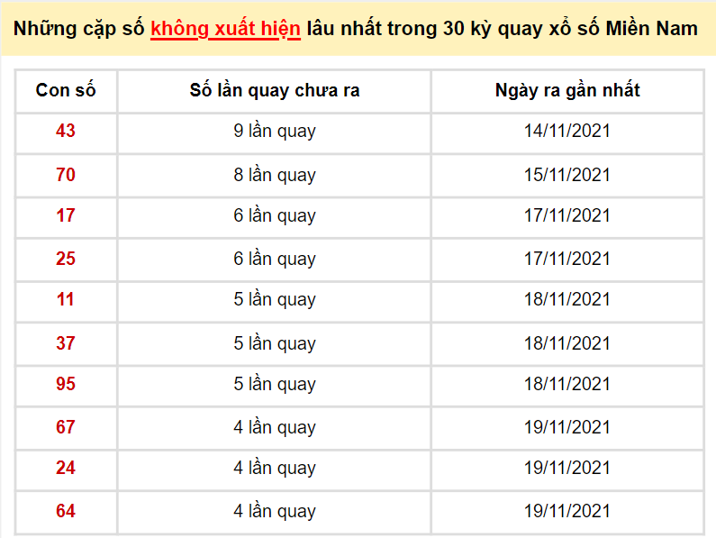 BÍ KÍP giúp KETQUAXS soi cầu XSMN 25/11/2021 và các ngày khác đều cho kết quả dự đoán chính xác nhất, TỈ LỆ trúng giải cao nhất là dựa trên kết quả XSMN ngày hôm trước và phương pháp xác suất thống kê chuyên sâu, các con số lâu ra nhất bạn chọn sẽ cho kết quả trúng thưởng đáng ngạt nhiên. Bạn có thể xem kết quả dự đoán XSMN ngày 25/11/2021 của KETQUAXS hoặc tham khảo kết quả thống kê giải đặt biệt XSMN và 10 cặp số xuất hiện nhiều nhất, xuất hiện ít nhất bên dưới để tự dự đoán kết quả XSMN hôm nay cho riêng mình.