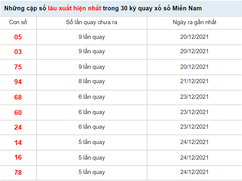 BÍ KÍP giúp KETQUAXS soi cầu XSMN 30/12/2021 và các ngày khác đều cho kết quả dự đoán chính xác nhất, TỈ LỆ trúng giải cao nhất là dựa trên kết quả XSMN ngày hôm trước và phương pháp xác suất thống kê chuyên sâu, các con số lâu ra nhất bạn chọn sẽ cho kết quả trúng thưởng đáng ngạt nhiên. Bạn có thể xem kết quả dự đoán XSMN ngày 30/12/2021 của KETQUAXS hoặc tham khảo kết quả thống kê giải đặt biệt XSMN và 10 cặp số xuất hiện nhiều nhất, xuất hiện ít nhất bên dưới để tự dự đoán kết quả XSMN hôm nay cho riêng mình.
