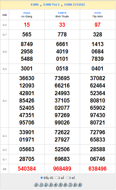 XSMN hôm nay thứ 5 ngày 31/3/2022 được mở thưởng tại 3 đài: Tây Ninh, An Giang, Bình Thuận. Dưới đây là phần chi tiết dự đoán, soi cầu XSMN hôm nay 31/3/2022 cho từng tỉnh: