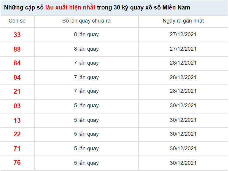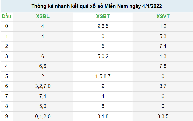 BÍ KÍP giúp KETQUAXS soi cầu XSMN 5/1/2022 và các ngày khác đều cho kết quả dự đoán chính xác nhất, TỈ LỆ trúng giải cao nhất là dựa trên kết quả XSMN ngày hôm trước và phương pháp xác suất thống kê chuyên sâu, các con số lâu ra nhất bạn chọn sẽ cho kết quả trúng thưởng đáng ngạt nhiên. Bạn có thể xem kết quả dự đoán XSMN ngày 5/1/2022 của KETQUAXS hoặc tham khảo kết quả thống kê giải đặt biệt XSMN và 10 cặp số xuất hiện nhiều nhất, xuất hiện ít nhất bên dưới để tự dự đoán kết quả XSMN hôm nay cho riêng mình.