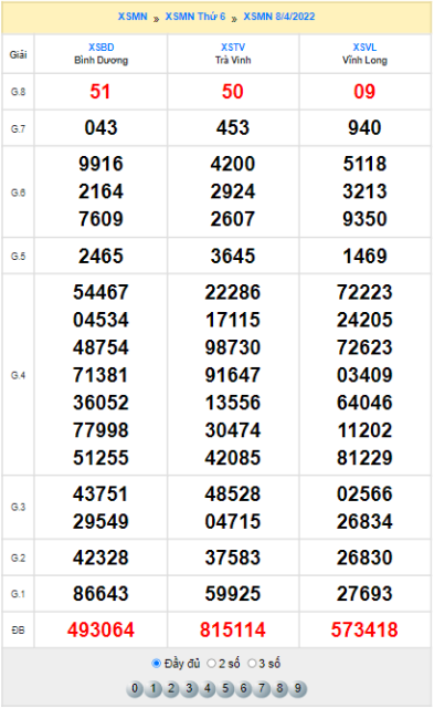 XSMN hôm nay thứ 8/4/2022 được mở thưởng tại 3 đài: Vĩnh Long, Bình Dương, Trà Vinh. Dưới đây là phần chi tiết dự đoán, soi cầu XSMN hôm nay 8/4/2022 cho từng tỉnh:
